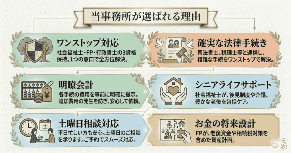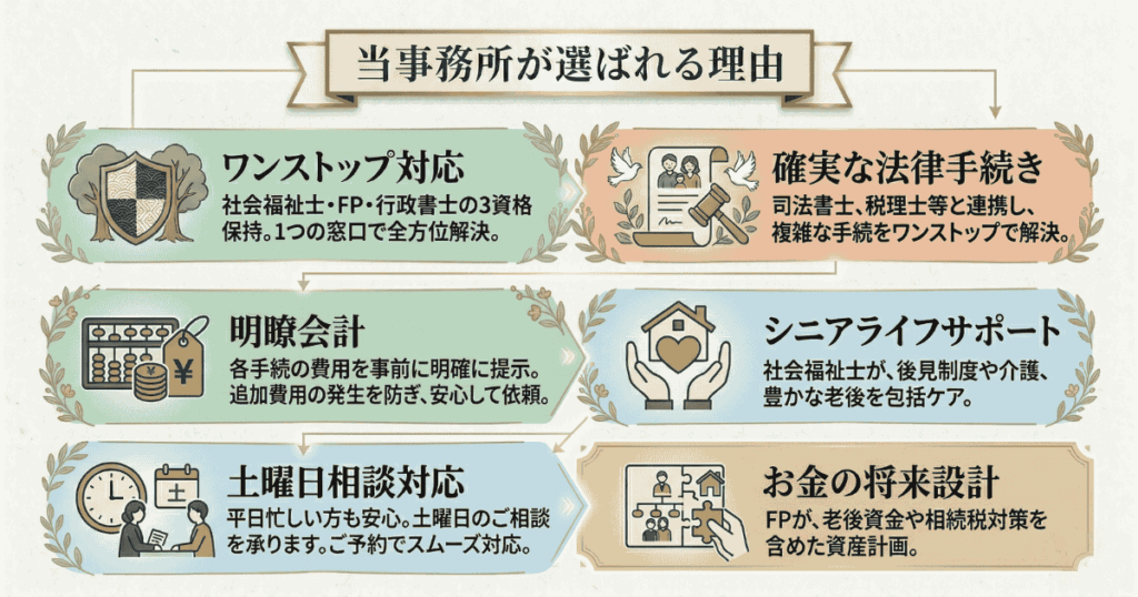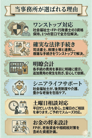 当事務所では、遺言・各種書類作成など単に手続きを代行するのではなく、法・お金・福祉等の多面的な視点から、皆様の抱える問題点(テーマ)を明らかにし、その解決策を提案いたします。