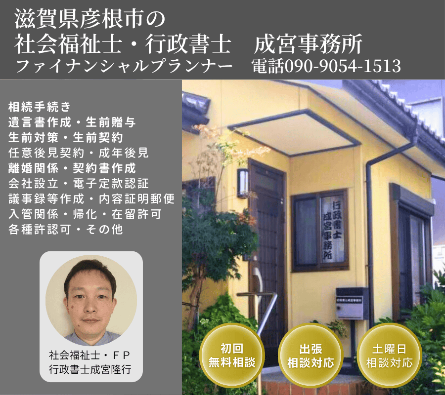 滋賀県彦根市の社会福祉士・FP・行政書士成宮事務所の成宮隆行と申します。