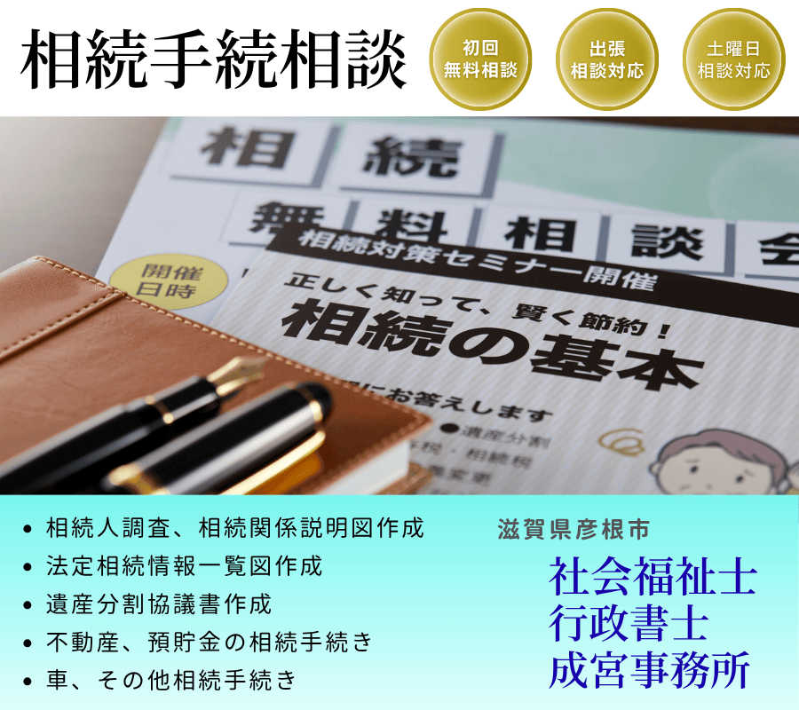 滋賀県彦根市の行政書士成宮事務所です。当事務所では、相続手続きに合わせてプランの最適化を行っております。そのため、依頼者にわかりやすく無駄のないお申し込みが可能だと思います。