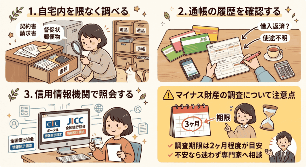 - 郵便物も確認し、借金に関する書類がないかチェックします。