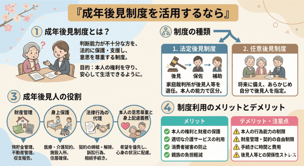 • 後見: 判断能力が欠けている方を対象とします。後見人は、本人の法律行為について代理権を持ち、本人を包括的に保護します。